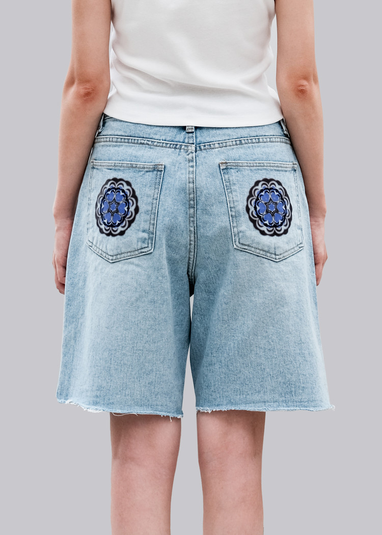- 깔끔한 연청 반바지 뒷면에 나염 스크린 기법으로 구름꽃 패턴이 프린트 된 쇼츠입니다.