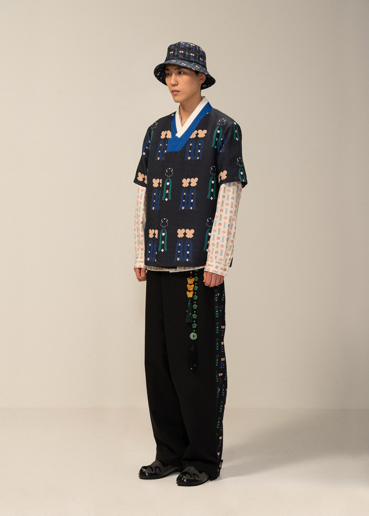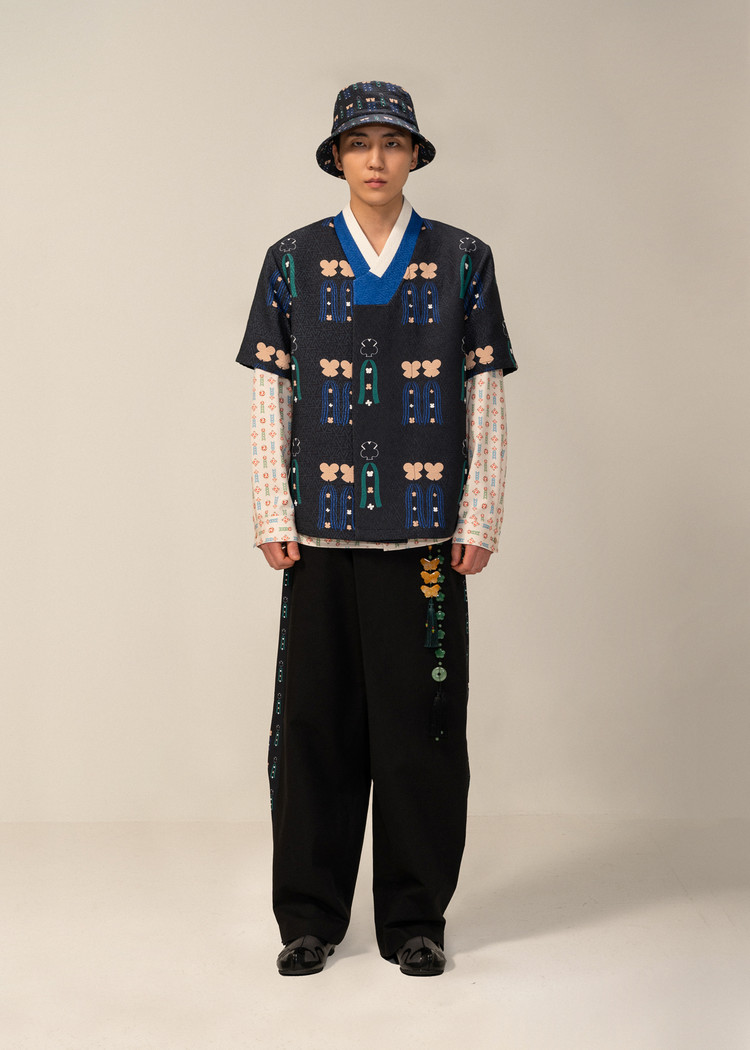 - 오우르 P9 데인티모란 패턴을 덧입히고 저고리의 동정과 깃, 도련, 그리고 거들지를 재해석한 크롭 자켓입니다.