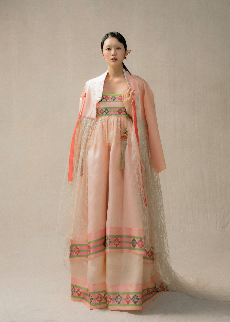 - 오우르 P9 데인티모란 패턴을 덧입히고 저고리의 동정과 깃, 도련, 그리고 거들지를 재해석한 크롭 자켓입니다.