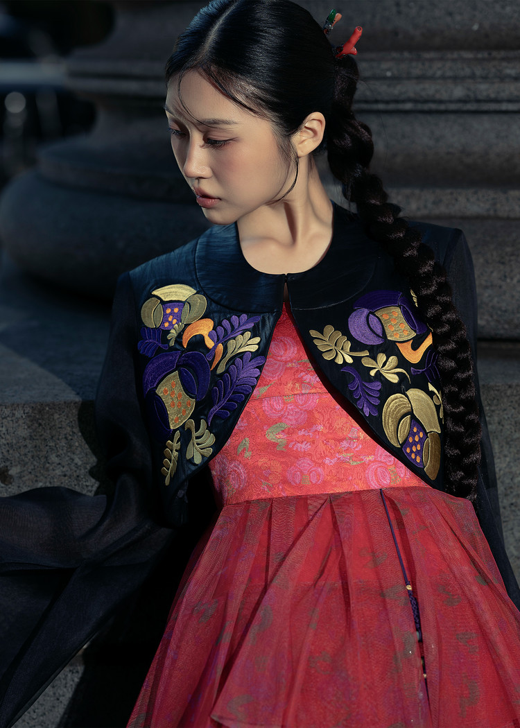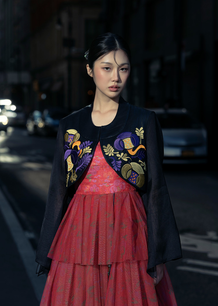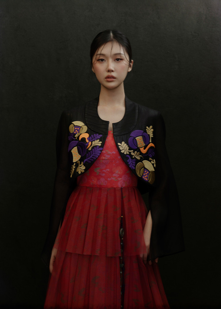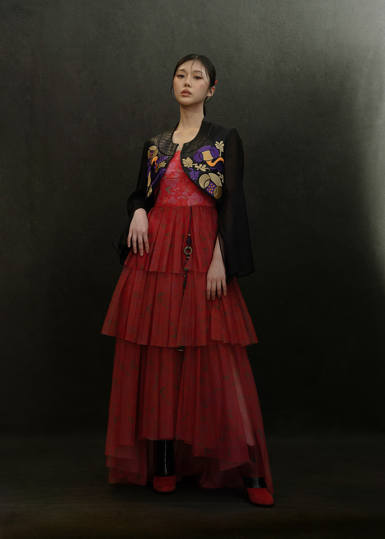 - 오우르 P9 데인티모란 패턴을 덧입히고 저고리의 동정과 깃, 도련, 그리고 거들지를 재해석한 크롭 자켓입니다.