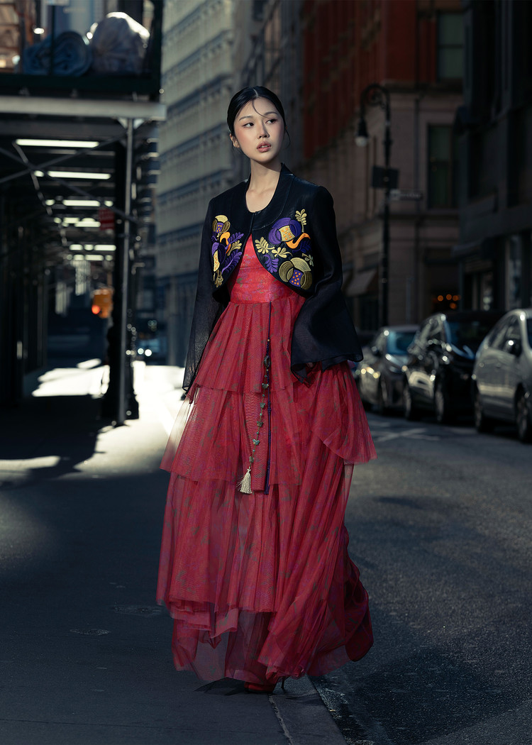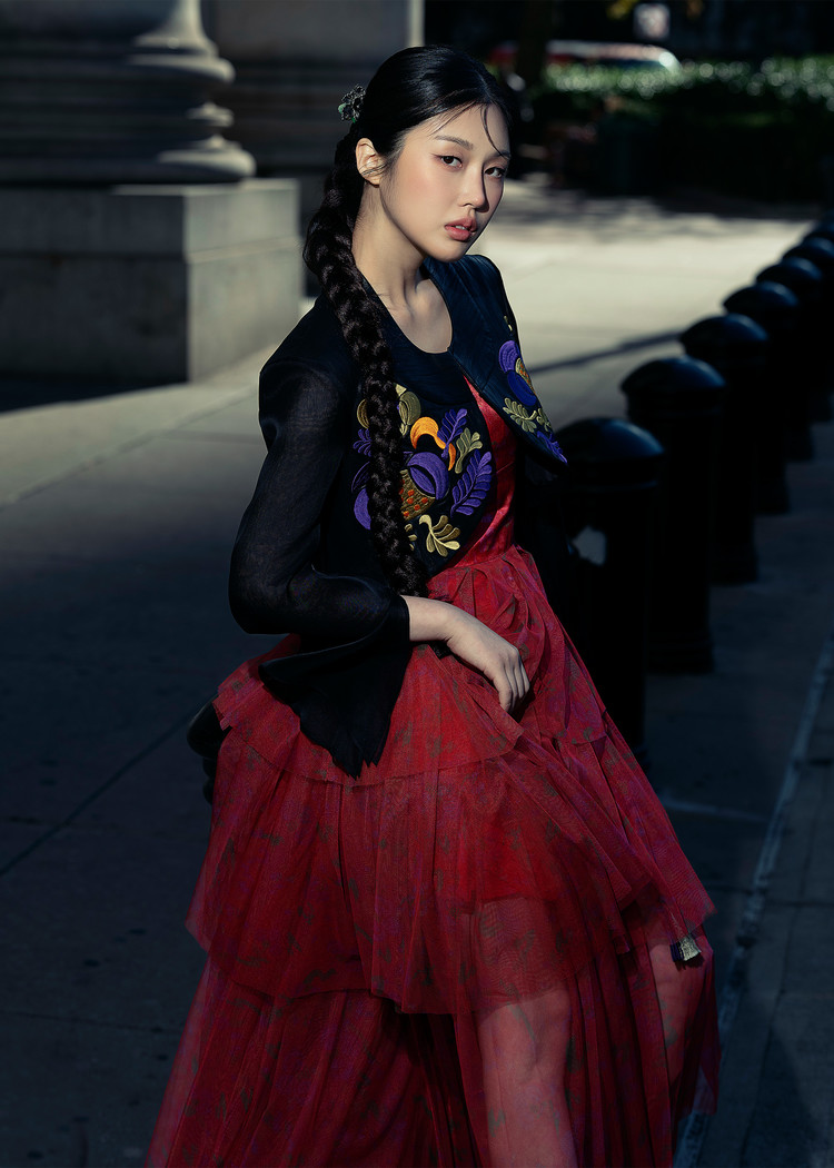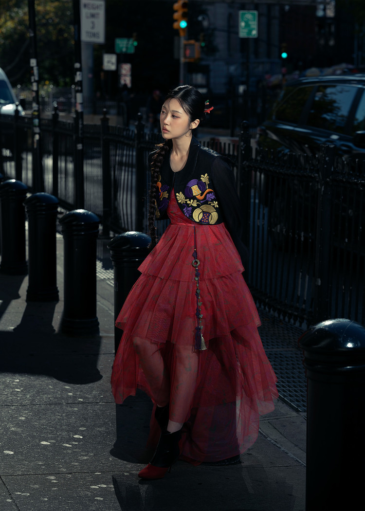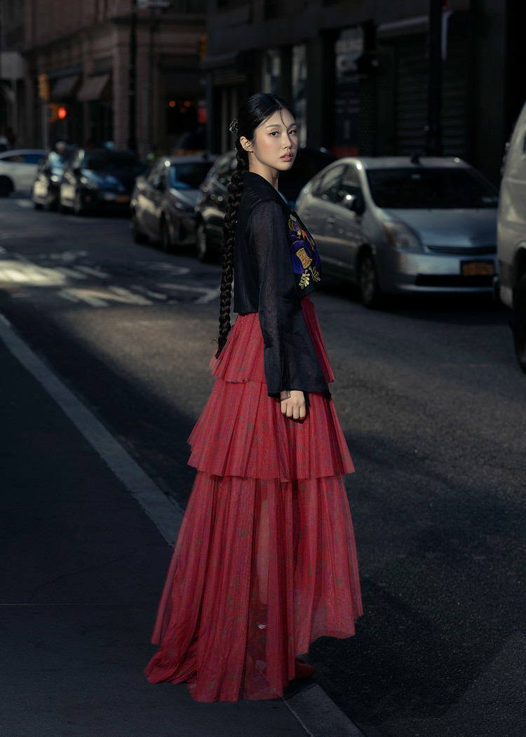- 오우르 P9 데인티모란 패턴을 덧입히고 저고리의 동정과 깃, 도련, 그리고 거들지를 재해석한 크롭 자켓입니다.