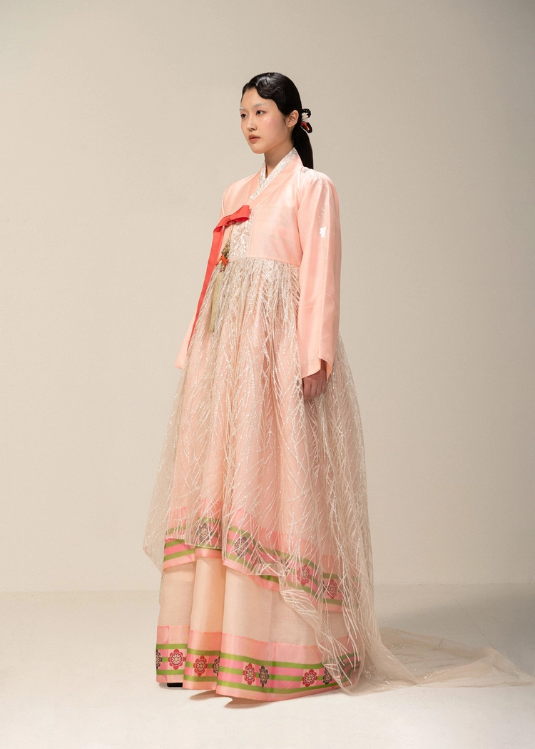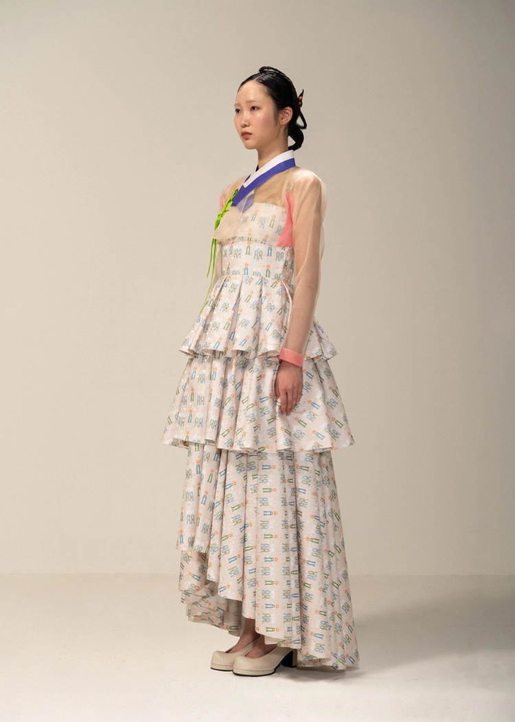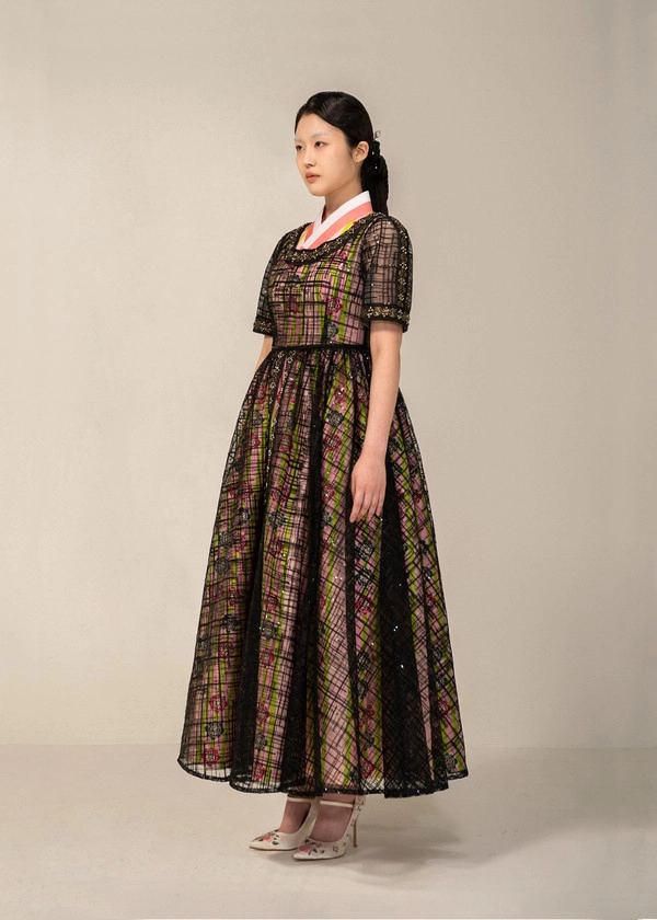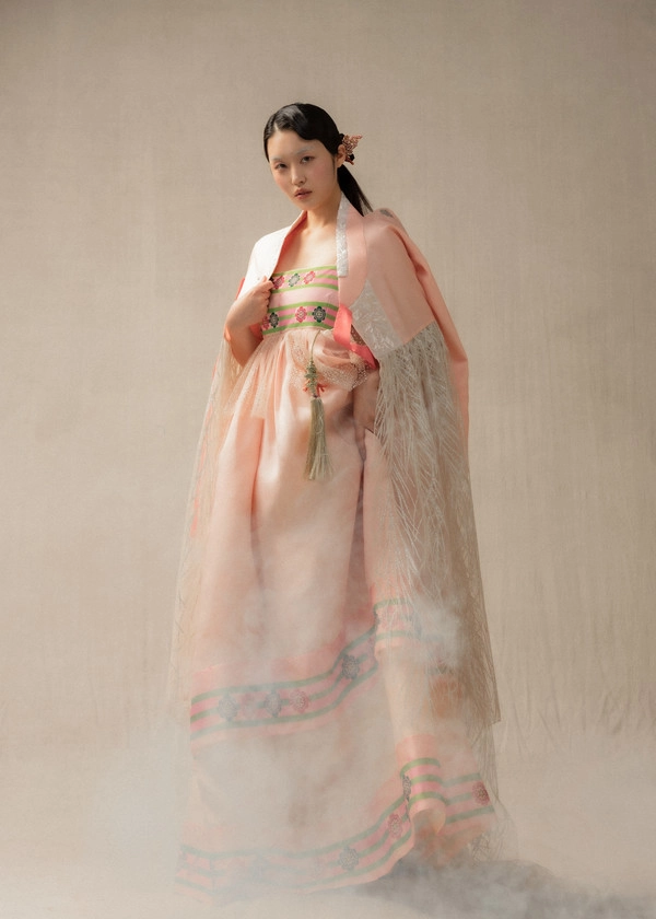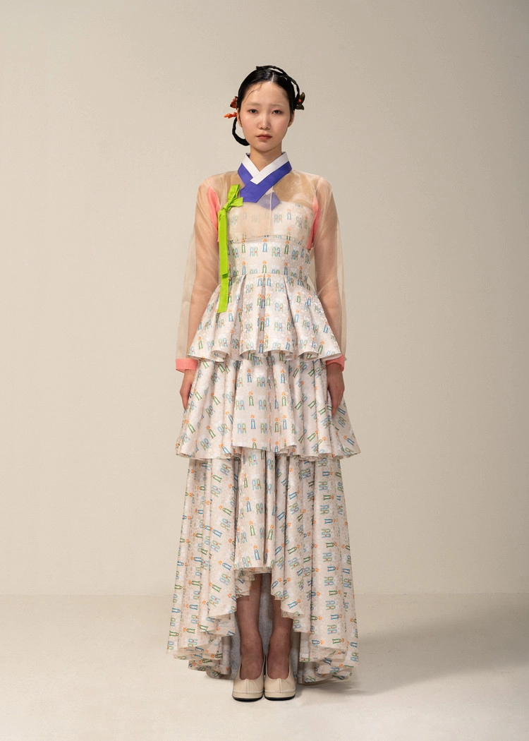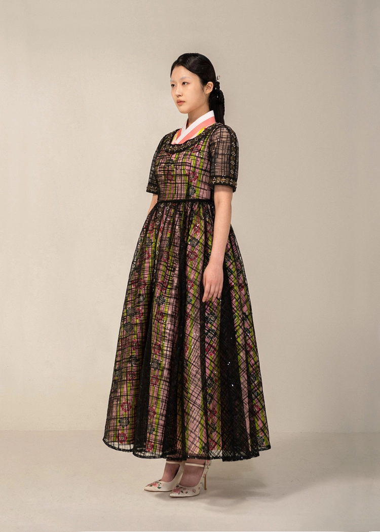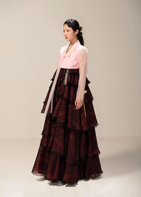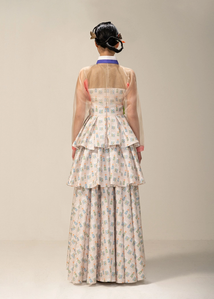 - 오우르 P9 데인티모란 패턴을 덧입히고 저고리의 동정과 깃, 도련, 그리고 거들지를 재해석한 크롭 자켓입니다.